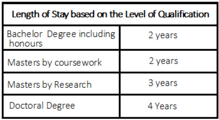 • Stay in Australia anywhere between 18 months to 4 years (depending on the stream and qualification completed)